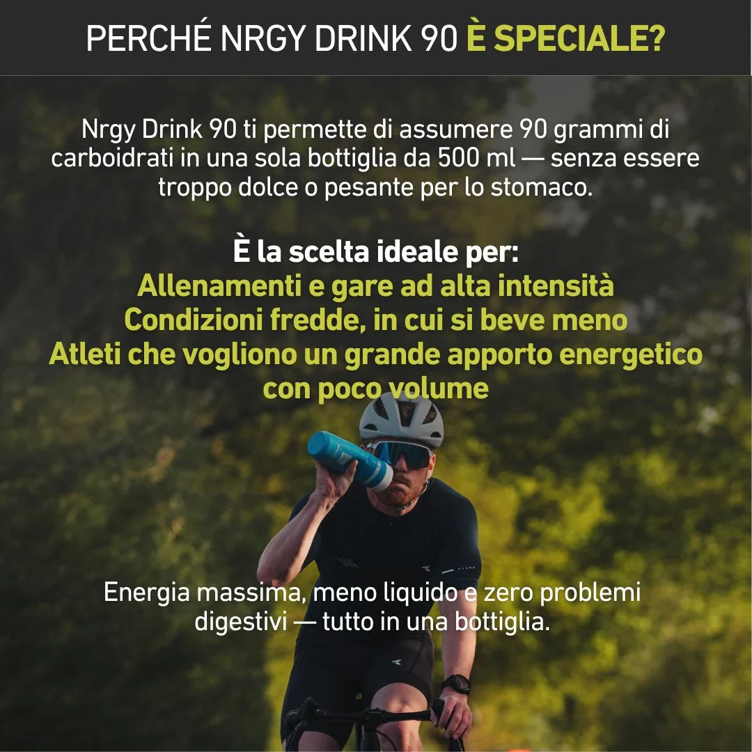 Nrgy Drink 90 è pensata per atleti di alto livello che si riforniscono con 90 g (o più) di carboidrati all’ora e vogliono farlo in modo efficiente — con meno liquidi e senza alcun disturbo digestivo.